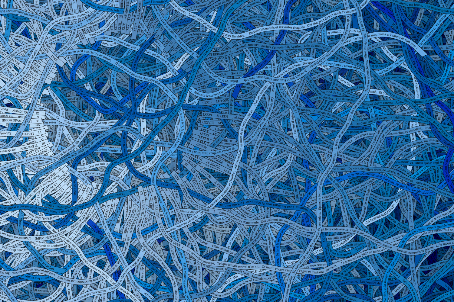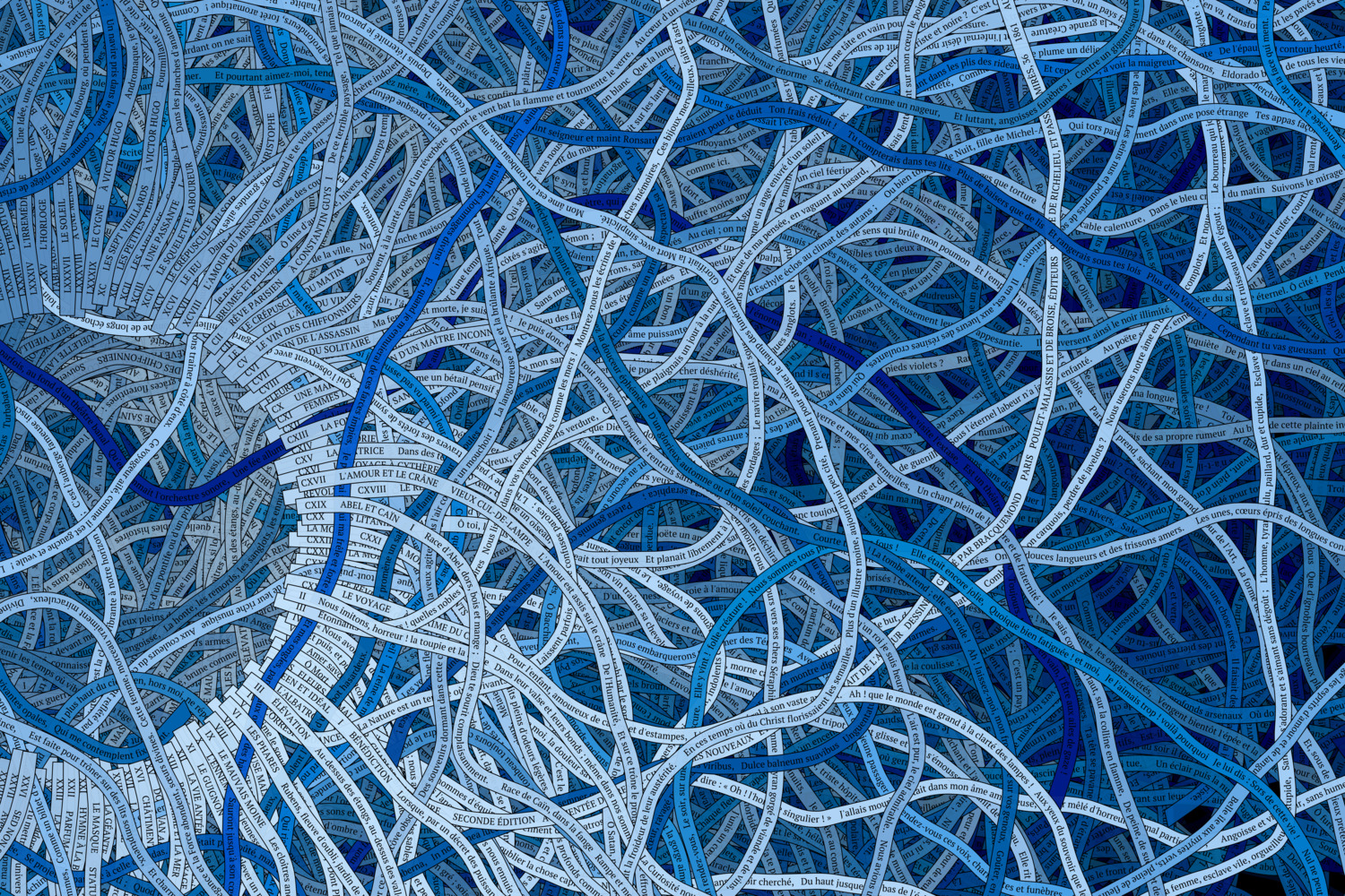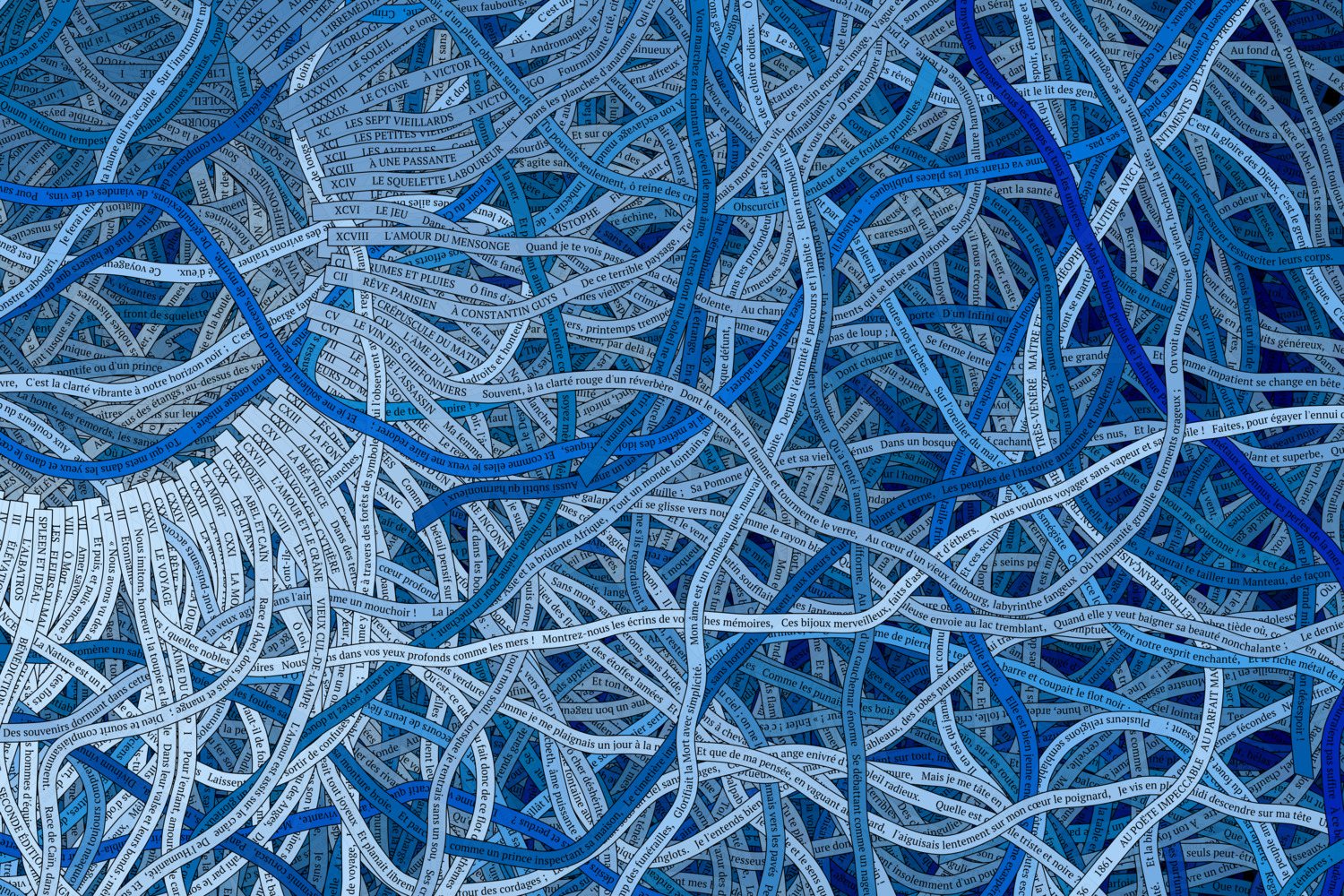 The present collection of generative art pieces is an avant-garde exploration, embodying Baudelaire's 126 poems as ribbons which evolve and flow according to the structure of the poetry. A visual realm is created where the ribbons intertwine and mingle, mirroring the structure of the text. The result is a dance between the individual poems in the book, with each ribbon moving independently, driven purely by the shape and construct of the words.