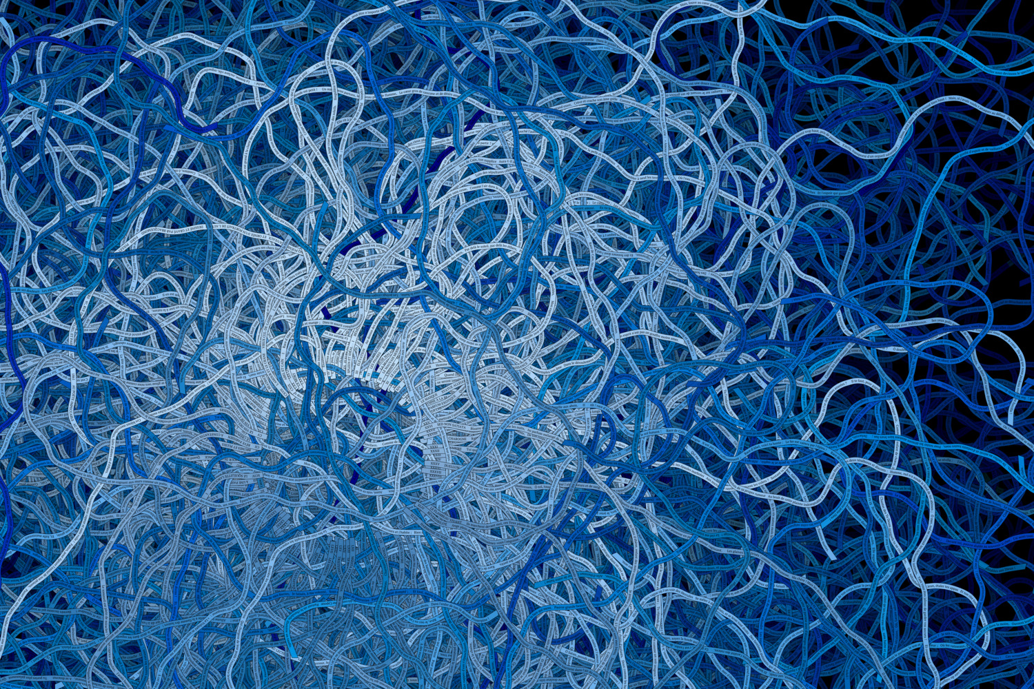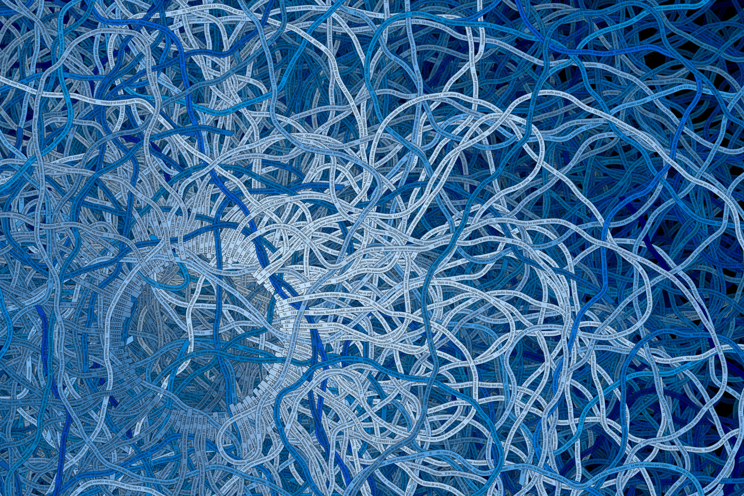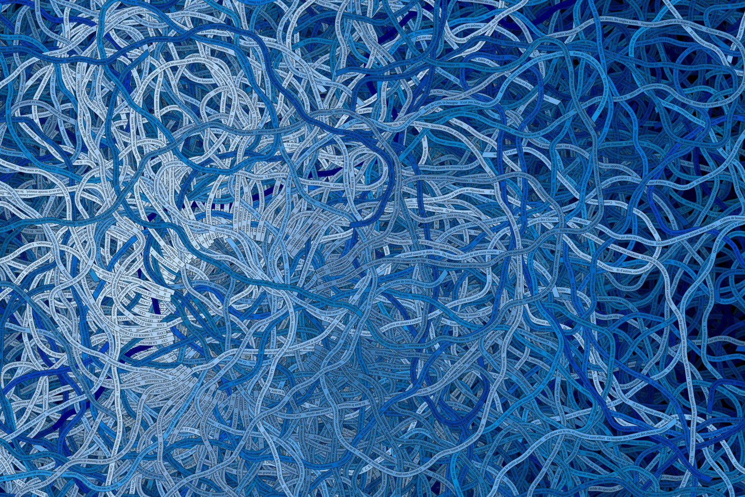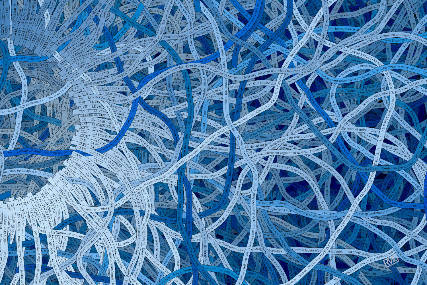 The present collection of generative art pieces is an avant-garde exploration, embodying Baudelaire's 126 poems as ribbons which evolve and flow according to the structure of the poetry. A visual realm is created where the ribbons intertwine and mingle, mirroring the structure of the text. The result is a dance between the individual poems in the book, with each ribbon moving independently, driven purely by the shape and construct of the words.